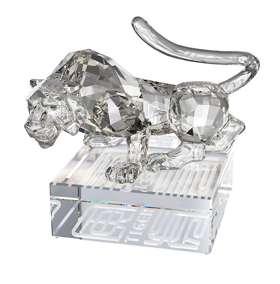 Размер: 7,6 x 9,4 x 8,4 см. Тигр — мощный знак китайского зодиака, воплощающий динамизм, харизму и энергию. Тигр выполнен из огранённых и неогранённых кристаллов оттенка Silver Shade, а его глаза завораживают мерцанием кристаллов Moroda Sahara. На подставке из гранёного прозрачного кристалла с матовой отделкой выгравировано название знака на английском языке и – древними иероглифами – на китайском.