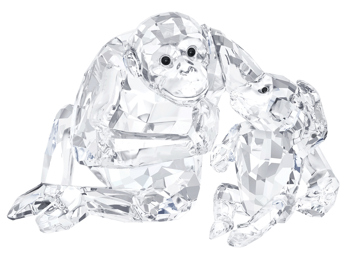 Размер: 5,8 x 8,9 x 5,1 см. Это произведение Swarovski, кристальная фантазия на тему живой природы, иллюстрирует тесную связь между матерью и её ребёнком. Оба шимпанзе сделаны из сверкающих прозрачных кристаллов с чёрными кристальными глазами.