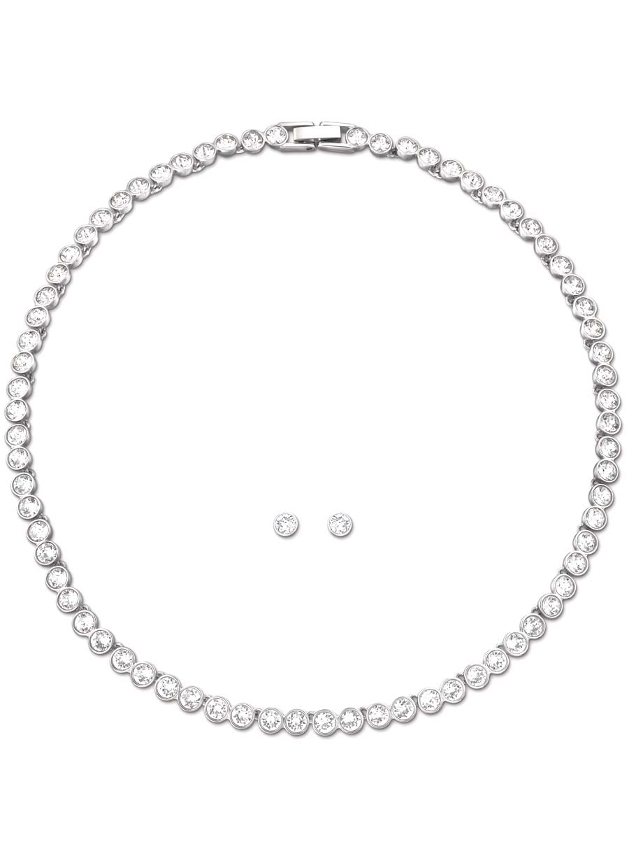 Длина ожерелья: 38 см. Длина серёг: 0,5 см. Благодаря этому восхитительному комплекту вы засияете подобно звезде. Этот комплект прекрасно подходит для праздничного сезона. Ожерелье и серьги с родиевым покрытием сверкают прозрачным кристальным паве. Идеальный подарок для дорогого вам человека.