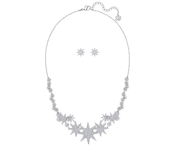 Длина ожерелья: 40 см. Длина серёг: 1 см. Благодаря этому восхитительному комплекту вы засияете подобно звезде. Этот комплект прекрасно подходит для праздничного сезона. Ожерелье и серьги с родиевым покрытием сверкают прозрачным кристальным паве. Идеальный подарок для дорогого вам человека.