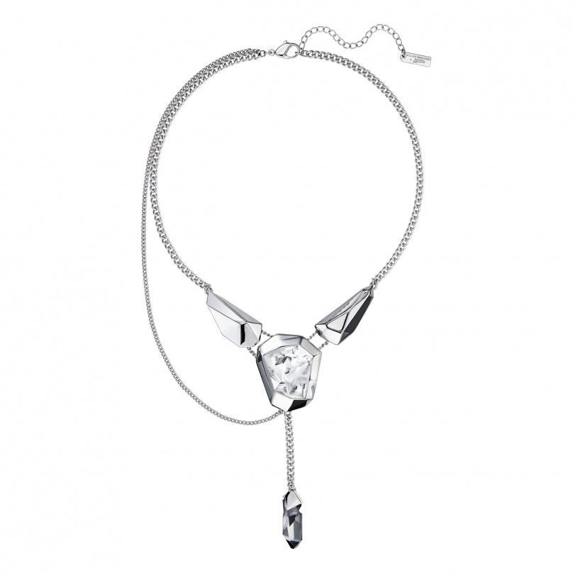 Длина ожерелья – 40 см. Драматичный центральный элемент сделан из прозрачных кристаллов огранки Kaputt, созданной этим дизайнером, в скульптурных гнёздах с родиевым покрытием. Они сверкают на асимметричной цепочке, покрытой тем же металлом. Это броское актуальное украшение внесёт в вашу коллекцию искру подиумного шика