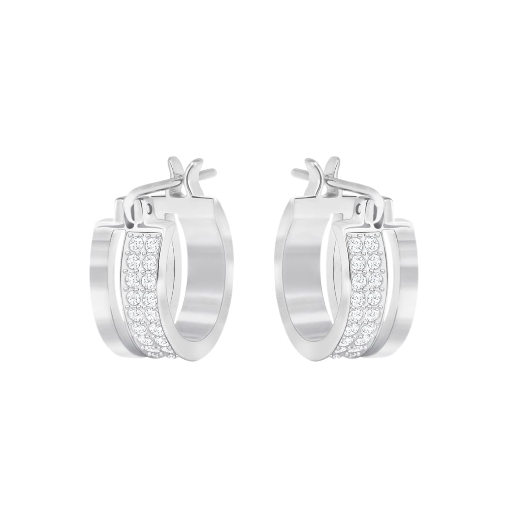 Длина: 1,5 см. Эти аккуратные серьги-кольца, современные и элегантные, идеально подходят на каждый день. Они станут замечательным подарком на любой праздник. Сочетание гладкого родиевого покрытия и кристального паве внесёт в повседневный образ гармоничную ноту блеска.