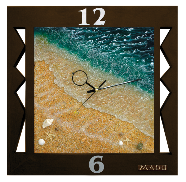 Размер корпуса: 47 x 47 x 6 см. Материал: сосна, ракушки, морские звезды. Часы выполнены в стиле Бонсэки - это искусство изображения пейзажей на темном фоне с помощью песка (кварца). Мастера Бонсэки используют натуральные камни и другие предметы для придания объема своим произведениям. Вода символизирует богатство, достаток и зажиточность.