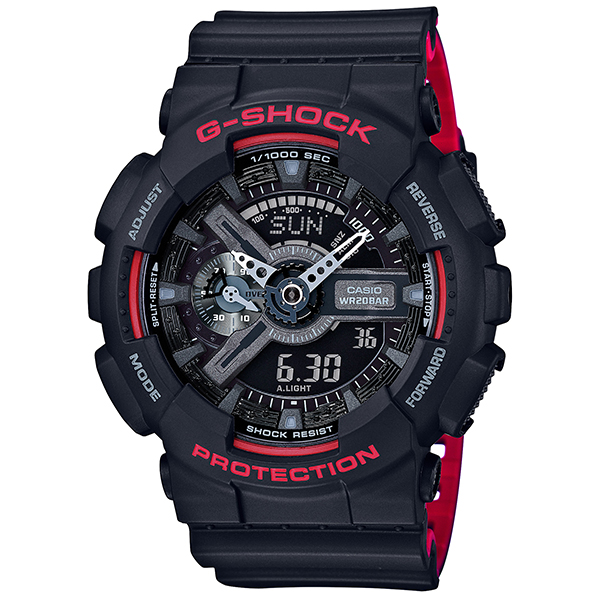 Диаметр корпуса: 52 мм. Наручные часы Casio GA-110HR-1A. Противоударный корпус защищает механизм от ударов и вибрации. Циферблат подсвечивается светодиодом, функция автоподсветки освещает циферблат при повороте часов к лицу. Защищены от магнитных полей. Мировое время – 48 городов (29 часовых поясов), всемирное координированное время (UTC). Автоматический переход на зимнее и летнее время, возможность включения/отключения данной функции. 12-ти и 24-х часовой формат времени. Секундомер с точностью показаний 1/1000с и временем измерения 100ч. Расчет скорости по выбранной дистанции. Сплит-хронограф. Таймер обратного отсчета от 1мин до 24ч с автоповтором.