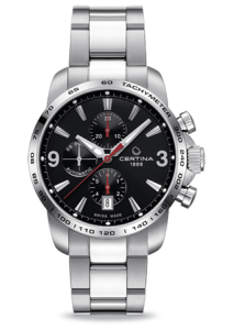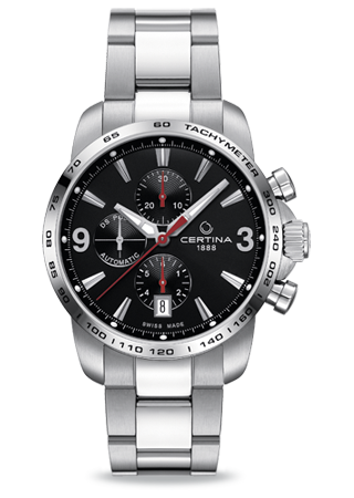 Диаметр корпуса: 42 мм. Швейцарский механизм с автоматическим подзаводом ETA, калибр C01.211. Запас хода 45 часов, частота колебаний баланса 21 600 пк/час, 15 камней. Центральные часовая и минутная стрелки, маленькие секунды на «9 часах». Апертура даты на «3 часах». Хронограф с центральной секундной стрелкой, 30-минутным и 6-часовым индикаторами на «12» и «6 часах» соответственно. Механизм персонализирован часовой маркой CERTINA. Безель с гравированной разметкой тахиметрической шкалы. Выступы корпуса защищают переводную коронку от случайных ударов. Сапфировое стекло повышенной стойкостью к возникновению царапин. Циферблат с матовой шлифовкой, аппликация часовых индексов и цифр с алмазной огранкой. Стрелки и индексы с покрытием Super-LumiNova®. Захлопывающаяся задняя крышка с прозрачным окном. Браслет с литыми звеньями из нерж. стали, браслетная застежка тройного сложения типа «бабочка», раскладывающаяся при нажатии на кнопки.