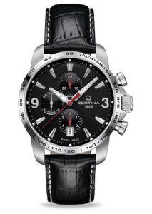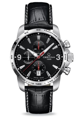 Диаметр корпуса: 42 мм. Швейцарский механизм с автоматическим подзаводом ETA, калибр C01.211. Запас хода 45 часов, частота колебаний баланса 21 600 пк/час, 15 камней. Центральные часовая и минутная стрелки, маленькие секунды на «9 часах». Апертура даты на «3 часах». Хронограф с центральной секундной стрелкой, 30-минутным и 6-часовым индикаторами на «12» и «6 часах» соответственно. Механизм персонализирован часовой маркой CERTINA. Безель с гравированной разметкой тахиметрической шкалы. Выступы корпуса защищают переводную коронку от случайных ударов. Циферблат с матовой шлифовкой, аппликация часовых индексов и цифр с алмазной огранкой.