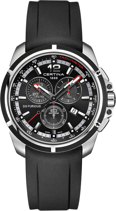 Диаметр корпуса: 42 мм. Швейцарский кварцевый механизм ETA, калибр G15.211, на 6 камнях. Точность хода с погрешностью не более -12/+18 секунд в месяц. Элемент питания №394 со сроком службы 35 месяцев. Хронограф с функцией ADD и SPLIT, центральная секундная стрелка, 30-минутным и 1/10-секундным индикаторами на «9» и «3 часах» соответственно. Центральные часовая и минутная стрелки, маленькие секунды на «6 часах». Индикация даты в апертуре на «4 часах». Безель с частичным покрытием. Циферблат с частичным гильошированием, аппликация часовых индексов, тахиметрическая шкала. Стрелки и индексы с покрытием Super-LumiNova® Защелкивающаяся задняя крышка с гравированным логотипом бренда.