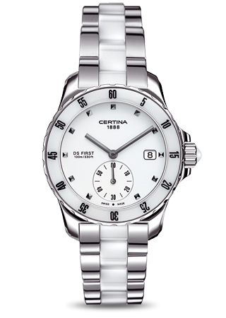 Диаметр корпуса: 34,8 мм. Швейцарский кварцевый механизм ETA с аналоговой индикацией. Точность хода с погрешностью не более -10/+15 сек. в месяц. Центральная часовая и минутная стрелки, маленький секундный индикатор смещен на отметку «6 часов». Индикация даты. Безель с керамической вставкой и контрастной разметкой. Циферблат в спортивном стиле, аппликация часовых индексов. Переводная коронка украшена кабошоном. Стрелки и индексы с покрытием Super-LumiNova®. Захлопывающаяся задняя крышка с гравированным логотипом бренда. Браслет с центральными звеньями из керамики, внешние литые звенья из нерж. стали, браслетная застежка, раскладывающаяся при нажатии на кнопки.