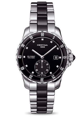 Диаметр корпуса: 34,8 мм. Швейцарский кварцевый механизм ETA с аналоговой индикацией. Точность хода с погрешностью не более -10/+15 сек. в месяц. Центральная часовая и минутная стрелки, маленький секундный индикатор смещен на отметку «6 часов». Индикация даты. Безель с керамической вставкой и контрастной разметкой. Циферблат в спортивном стиле, аппликация часовых индексов. Переводная коронка украшена кабошоном. Стрелки и индексы с покрытием Super-LumiNova®. Захлопывающаяся задняя крышка с гравированным логотипом бренда. Браслет с центральными звеньями из керамики, внешние литые звенья из нерж. стали, браслетная застежка, раскладывающаяся при нажатии на кнопки.