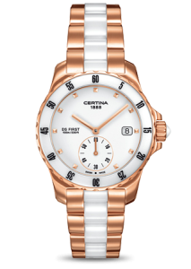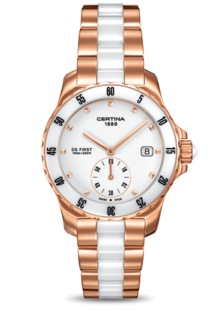Диаметр корпуса: 34,8 мм. Точность хода не хуже -10 +15 сек./в месяц. Смещенная секундная стрелка. Индикатор даты. Стальной безель с керамической вставкой и минутной индикацией. Циферблат белый с накладными часовыми маркерами, покрытыми PVD-составом цвета розового золота. Регулируемый по длине браслет из нержавеющей стали с вставками белой керамики. Надежный браслетный замок с тройным сгибом.