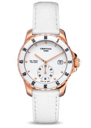 Диаметр корпуса: 34,8 мм. Диаметр корпуса: 34,8 мм. Точность хода не хуже -10 +15 сек./в месяц. Смещенная секундная стрелка. Индикатор даты. Стальной безель с керамической вставкой и минутной индикацией. Циферблат белый с накладными часовыми маркерами, покрытыми PVD-составом цвета розового золота.