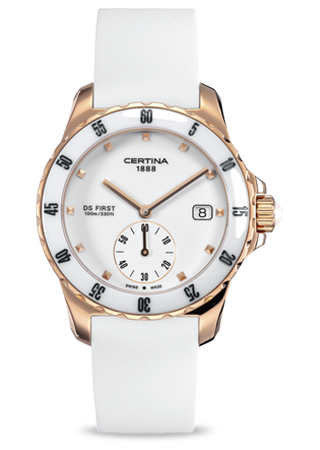 Диаметр корпуса: 34,8 мм. Точность хода не хуже -10 +15 сек./в месяц. Смещенная секундная стрелка. Индикатор даты. Стальной безель с керамической вставкой и минутной индикацией. Циферблат белый с накладными часовыми маркерами, покрытыми PVD-составом цвета розового золота.