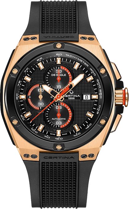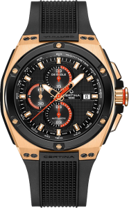 Диаметр корпуса: 46 мм. Швейцарский механизм с автоматическим подзаводом ETA, калибр C01.211. Запас хода 45 часов, частота колебаний баланса 21 600 пк/час, 15 камней. Центральные часовая и минутная стрелки, маленькие секунды на «9 часах». Апертура даты на «3 часах». Хронограф с центральной секундной стрелкой, 30-минутным и 6-часовым индикаторами на «12» и «6 часах» соответственно. Безель с рельефной поверхностью и PVD-покрытием черного цвета крепится к корпусу декоративными винтами с шестигранным шлицом. Выступы корпуса защищают переводную коронку от случайных ударов. Циферблат с гильошированием, рельефная шкала с часовыми метками, яркие акценты красного или зеленого цветов. Стрелки и индексы с покрытием Super-LumiNova®. Задняя крышка с прозрачным окном из сапфирового стекла крепится к корпусу 4 винтами. Между сапфировым стеклом и механизмом находится ажурное изображение черепахи – логотипа марки CERTINA. Каучуковый ремешок с тиснением, объемная литая застежка с шипом.