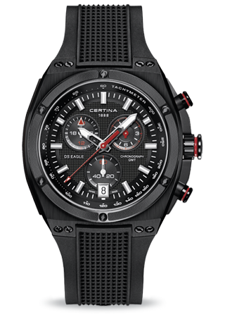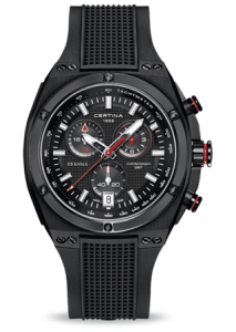 Диаметр корпуса: 46 мм. Швейцарский кварцевый механизм ETA, калибр G10.961, на 4 камнях. Точность хода с погрешностью не более -10/+15 секунд в месяц. Хронограф с функцией ADD и SPLIT, центральная секундная стрелка, 60-минутный и 12-часовой индикаторы на«2 часах». Индикатор времени второго часового пояса GMT в 24-часовом формате на отметке «10 часов». Центральные часовая и минутная стрелки, маленькие секунды на «6 часах». Индикация даты в апертуре на отметке «6 часов». Функция EOL - индикация низкого уровня заряда батареи при помощи движения секундной стрелки. Безель с рельефной поверхностью черного цвета крепится к корпусу декоративными винтами с шестигранным шлицом. Выступы корпуса защищают переводную коронку от случайных ударов. Циферблат с гильошированием, рельефная шкала с часовыми метками, яркие акценты красного или зеленого цветов. Стрелки и индексы с покрытием Super-LumiNova®. Задняя крышка с гравированным объемным изображением черепахи – логотипа марки CERTINA крепится к корпусу 4 винтами. Каучуковый ремешок с тиснением, объемная литая застежка с шипом.