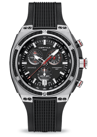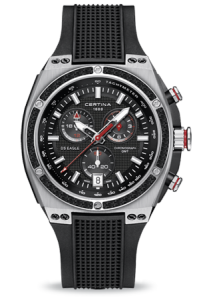 Диаметр корпуса: 46 мм. Швейцарский кварцевый механизм ETA, калибр G10.961, на 4 камнях. Точность хода с погрешностью не более -10/+15 секунд в месяц. Хронограф с функцией ADD и SPLIT, центральная секундная стрелка, 60-минутный и 12-часовой индикаторы на«2 часах». Индикатор времени второго часового пояса GMT в 24-часовом формате на отметке «10 часов». Центральные часовая и минутная стрелки, маленькие секунды на «6 часах». Индикация даты в апертуре на отметке «6 часов». Функция EOL - индикация низкого уровня заряда батареи при помощи движения секундной стрелки. Безель с рельефной поверхностью черного цвета крепится к корпусу декоративными винтами с шестигранным шлицом. Выступы корпуса защищают переводную коронку от случайных ударов. Циферблат с гильошированием, рельефная шкала с часовыми метками, яркие акценты красного или зеленого цветов. Стрелки и индексы с покрытием Super-LumiNova®. Задняя крышка с гравированным объемным изображением черепахи – логотипа марки CERTINA крепится к корпусу 4 винтами. Каучуковый ремешок с тиснением, объемная литая застежка с шипом.
