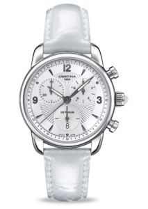 Диаметр корпуса: 34,5 мм. Швейцарский кварцевый механизм. Точность хода с погрешностью не более -12/+18 секунд в месяц. Хронограф с функцией ADD и SPLIT, центральная секундная стрелка, 30-минутным и 1/10-секундным индикаторами на «10» и «2 часах» соответственно. Центральные часовая и минутная стрелки, маленькие секунды на «6 часах». Индикация даты в апертуре на «6 часах». Выступы корпуса защищают переводную коронку от случайных ударов. Переводная коронка украшена кабошоном. Циферблат с гильошированием, аппликация часовых индексов с алмазной огранкой или рисованные римские цифры. Стрелки и индексы с покрытием Super-LumiNova® Защелкивающаяся задняя крышка с гравированным логотипом бренда.