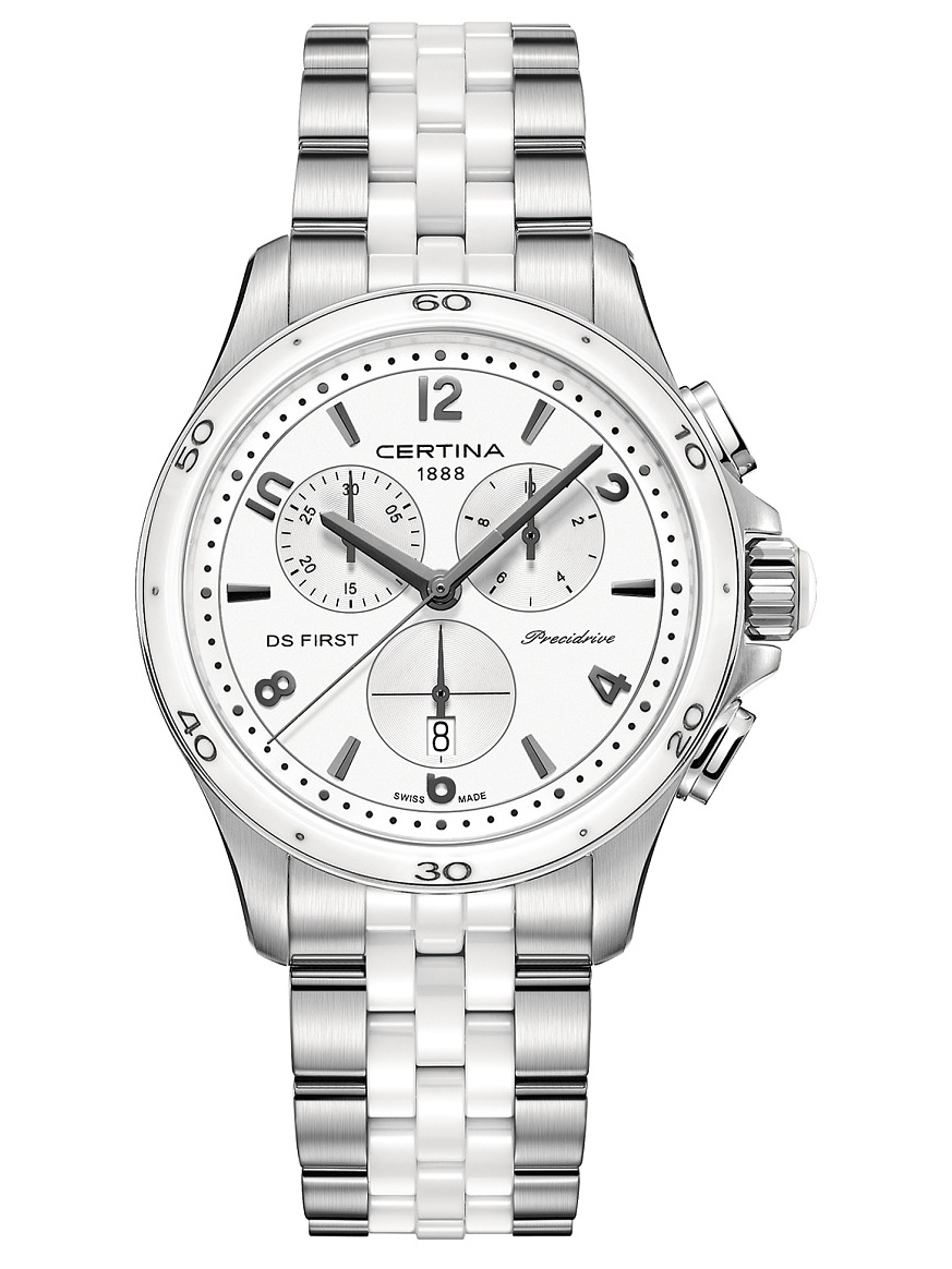 Диаметр корпуса: 38 мм. Швейцарский кварцевый механизм ETA, калибр G15.212 AA PreciDrive™, на 6 камнях. Повышенная точность хода с погрешностью не более -/+10 секунд в год. Хронограф с функцией ADD и SPLIT, центральная секундная стрелка, 30-минутным и 1/10-секундным индикаторами на «9» и «3 часах» соответственно. Центральные часовая и минутная стрелки, маленькие секунды на «6 часах». Индикация даты в апертуре на «6 часах». Безель из керамики с ребристой насечкой или гравированной разметкой. Сапфировое стекло повышенной стойкостью к возникновению царапин. Циферблат с лакированной поверхностью, аппликация часовых индексов и цифр с покрытием цвета золота или никелировкой и алмазной огранкой. Переводная коронка украшена керамическим кабошоном. Выступы корпуса защищают переводную коронку от случайных ударов. Захлопывающаяся задняя крышка с гравированным логотипом бренда. Браслет с центральными звеньями из керамики, внешние литые звенья из нерж. стали, браслетная застежка тройного сложения типа «бабочка», раскладывающаяся при нажатии на кнопки.