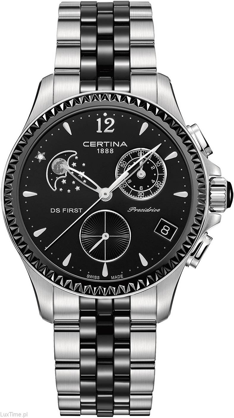 Диаметр корпуса: 38 мм. Базель 2016. Швейцарский кварцевый механизм ETA, калибр G10.962 BH PreciDrive™, на 4 камнях. Повышенная точность хода с погрешностью не более -/+10 секунд в год. Индикатор лунных фаз на отметке «10 часов». Хронограф с функцией ADD и SPLIT, центральная секундная стрелка, 60-минутный индикатор на «2 часах». Центральные часовая и минутная стрелки, маленькие секунды на «6 часах». Индикация даты в апертуре на «4 часах». Безель из керамики с ребристой насечкой. Сапфировое стекло повышенной стойкостью к возникновению царапин. Циферблат с лакированной поверхностью, аппликация часовых индексов и цифр, инкрустация бриллианта в виде стилизованной «счастливой звезды» над апертурой фаз Луны. Переводная коронка украшена керамическим кабошоном. Выступы корпуса защищают переводную коронку от случайных ударов. Захлопывающаяся задняя крышка с гравированным логотипом бренда. Браслет с центральными звеньями из керамики, внешние литые звенья из нерж. стали, браслетная застежка тройного сложения типа «бабочка», раскладывающаяся при нажатии на кнопки.
