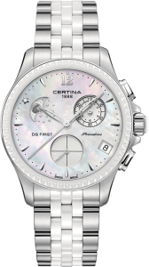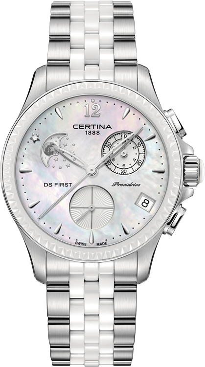 Диаметр корпуса: 38 мм. Базель 2016. Швейцарский кварцевый механизм ETA, калибр G10.962 BH PreciDrive™, на 4 камнях. Повышенная точность хода с погрешностью не более -/+10 секунд в год. Индикатор лунных фаз на отметке «10 часов». Хронограф с функцией ADD и SPLIT, центральная секундная стрелка, 60-минутный индикатор на «2 часах». Центральные часовая и минутная стрелки, маленькие секунды на «6 часах». Индикация даты в апертуре на «4 часах». Безель из керамики с ребристой насечкой. Сапфировое стекло повышенной стойкостью к возникновению царапин. Циферблат с лакированной поверхностью, аппликация часовых индексов и цифр, инкрустация бриллианта в виде стилизованной «счастливой звезды» над апертурой фаз Луны. Переводная коронка украшена керамическим кабошоном. Выступы корпуса защищают переводную коронку от случайных ударов. Захлопывающаяся задняя крышка с гравированным логотипом бренда. Браслет с центральными звеньями из керамики, внешние литые звенья из нерж. стали, браслетная застежка тройного сложения типа «бабочка», раскладывающаяся при нажатии на кнопки.