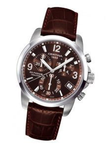 Диаметр корпуса: 40 мм. Кварцевый хронограф. Секундная стрелка смещена на маленький циферблат (в 6 часов). Дополнительные циферблаты хронографа: на 30 минут и 1/10 доли секунд. Секундомер с режимами ADD и SPLIT. Окошко даты. Особая технология повышения надежности и защиты от проникновения влаги DS (Double Security) - специальное устойчивое к вибрации и ударам крепление механизма, дополнительные прокладки в конструкции заводной головки и сопряжении задней крышки и корпуса часов. Светонакопительный состав на стрелках и маркерах часа. Кожаный ремешок.