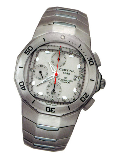 Диаметр корпуса: 38 мм. Линия DS Coronation оснащается однонаправленным вращающимся рантом, циферблатом серого цвета и специальной системой Double Security DS+System с завинчивающейся заводной головкой и задней крышкой, что обеспечивает водонепроницаемость до глубины 100 м. Механизм с автоподздводом со стрелками хронографа посередине, и версия из титана с автоподзаводом с тремя меньшими по размеру 12-часовыми, 30-минутными стрелками и сплит-секундомером с 6-ти, 9-ти и 12-ти часовыми отметками и календарным окошком рядом с цифрой 3.