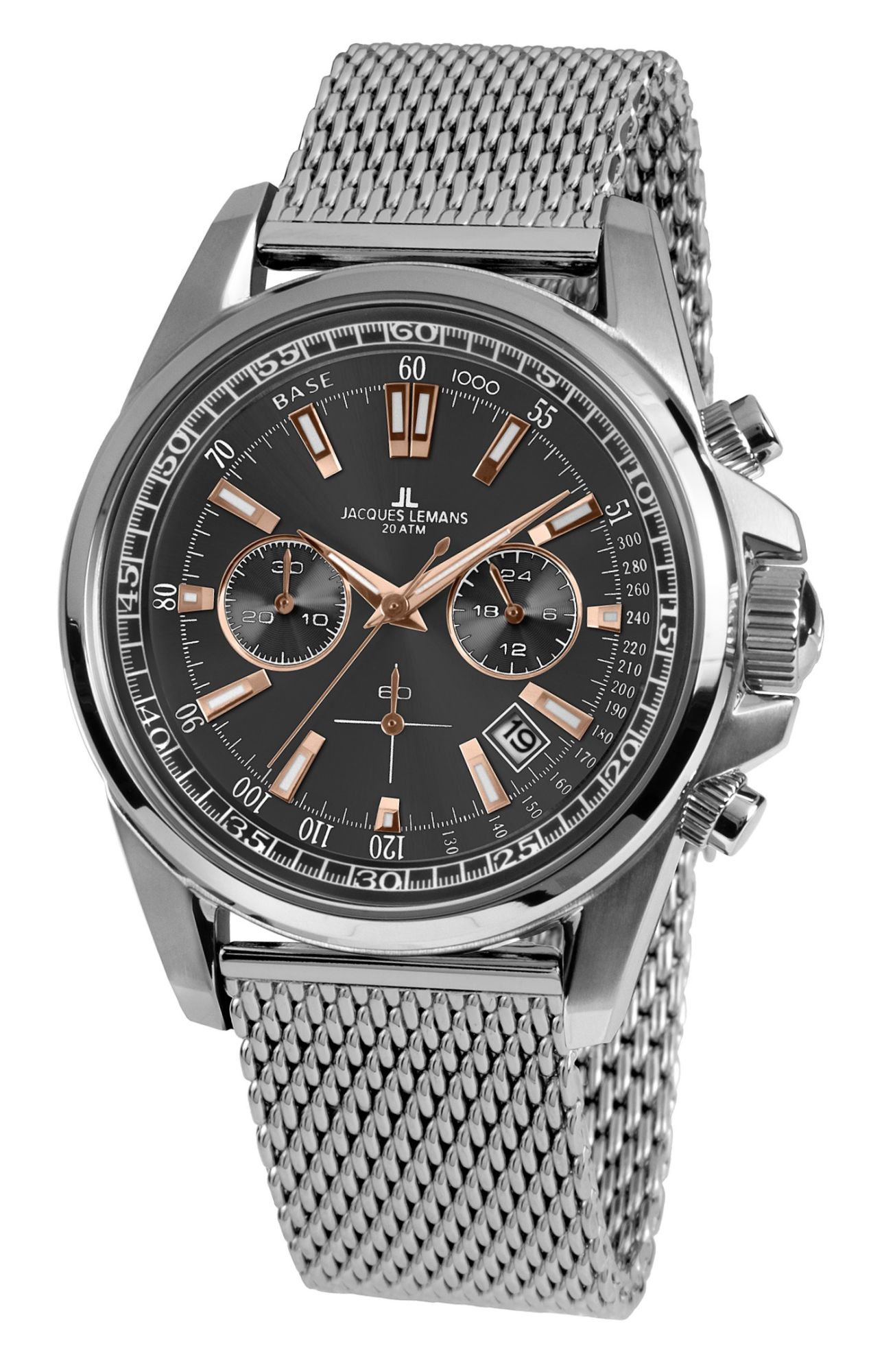 Диаметр корпуса: 44 мм. Часы-хронограф с секундомером и тахиметром. Окошко даты. Заводная головка с защитой. Браслет миланского плетения.