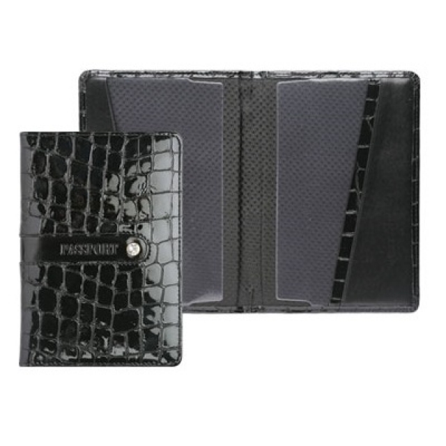 Размеры: 96х138х4 мм. Обложка для паспорта "Elisir", коллекция «Ружена» с белым кристаллом "Swarovski", из натуральной кожи - сочетание чёрной лаковой рептилии и гладкого чёрного лака. Тиснение "Passport". Внутри карманы из пластика и 3 полукармана из кожи.