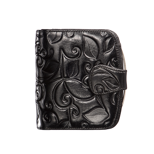 Размер: 9,5x11 см. Материал: FLOWER EMBOSS LEATHER BLACK.Удивительно компактная – при огромном количестве отделений – модель. Два блока для карточек. Первый – открытый, его удобно использовать под дисконтные карты. Здесь же - карман с прозрачным окошком и открытый карман за ним. Второй блок закрывается на отдельную кнопку, он идеален для банковских карт. Между блоками для карт - удобное отделение для мелочи с классическим кошельковым замком. Отделение для купюр – просторное, с перегородкой.
